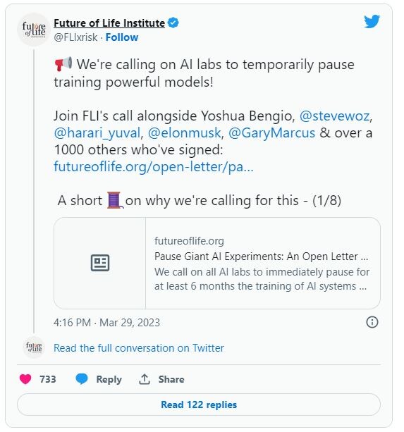 “This pause should be public and verifiable, and include all key actors. If such a pause cannot be enacted quickly, governments should step in and institute a moratorium,” it wrote.
