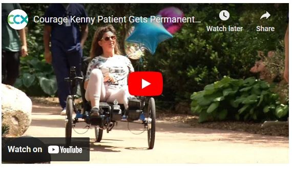 A crowd of family, friends, doctors and physical therapists gathered outside Courage Kenny Rehabilitation Institute in Golden Valley on Thursday morning to watch Elisha Aurness receive a recumbent tricycle — a surprise donation courtesy of Birdies4Brains.