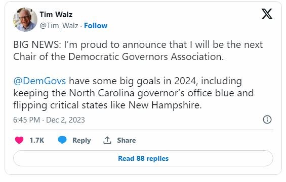 "I look forward to taking that record of winning and delivering to this role, and building on the DGA’s record of success as we have an exciting map of eleven governor’s races next year,” said Walz in a statement.