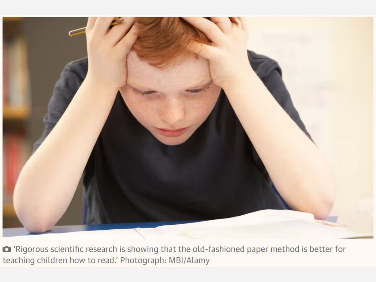 I would go even further than Froud in delineating what’s at stake. For more than a decade, social scientists, including the Norwegian scholar Anne Mangen, have been reporting on the superiority of reading comprehension and retention on paper. As Froud’s team says in its article: “Reading both expository and complex texts from paper seems to be consistently associated with deeper comprehension and learning” across the full range of social scientific literature.