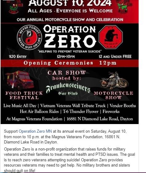 Mark your calendars for a day of support and camaraderie in Dayton, where the Magnus Veterans Foundation will play host to the annual Operation Zero MN event, happening on Saturday, August 10, from noon to 10 p.m. The non-profit Operation Zero is dedicated to a cause that's both urgent and necessary - providing resources for military veterans and their families grappling with mental health challenges and PTSD, striving toward the ambitious goal of eliminating veteran suicide attempts.