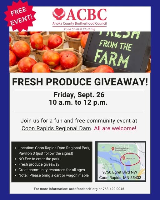 Coon Rapids, MN – Friday, September 26, 2025 — Today marks the last chance this year to take part in a community favorite: the ACBC Food Shelf’s final free outdoor produce distribution of the season. From 10 a.m. to 12 p.m., Pavilion 3 at Coon Rapids Dam Regional Park (9750 Egret Blvd. NW) will transform into a hub of fresh, healthy abundance — and everyone is invited.