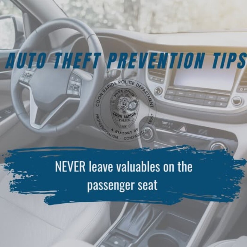The safety reminder coincides with CRPD’s broader investment in combating auto-related crimes. Earlier this year, the Coon Rapids City Council accepted a Minnesota Department of Public Safety Auto Theft Prevention Grant, which will fund the purchase of two movable Automated License Plate Recognition (ALPR) units.