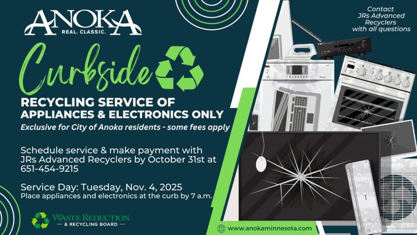 Anoka, MN — Anoka residents have a final opportunity to participate in the City’s fall curbside recycling event for household appliances and electronics, scheduled for Tuesday, November 4, 2025. The City of Anoka is partnering with JRs Advanced Recyclers to provide this convenient pick-up service. The collection is strictly limited to household appliances and electronics — no other materials will be accepted.