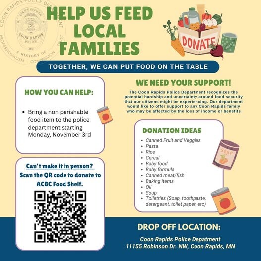 The collection site is the Coon Rapids Police Department facility, available during regular operating hours. The announcement did not specify an end date for the drive, so residents are encouraged to deliver donations early.