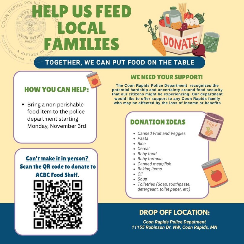 COON RAPIDS, MN — The Coon Rapids Police Department (CRPD) has launched a community food drive aimed at helping less-fortunate residents by collecting non-perishable food items for families in need. The initiative began on Monday, November 3, 2025, and remains open-ended, encouraging residents to contribute as soon as possible.