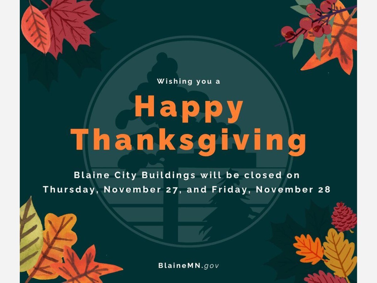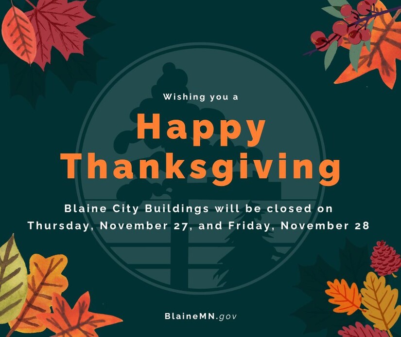 The City of Blaine extends its best wishes for a safe, restful, and enjoyable Thanksgiving weekend to all residents. Appreciation is extended to the police officers, public works staff, and other essential personnel who serve the community throughout the holiday.