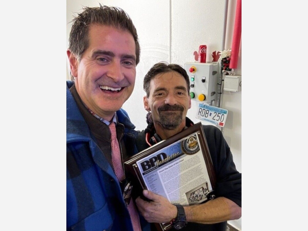 During a later visit, Raymond asked Chief Podany whether he had ever seen the small office behind the car wash. When he shared a photo, it revealed a full wall covered with BPD memorabilia: business cards, photographs, news clippings, thank-you notes, and small department emblems. Each item had been collected over time.