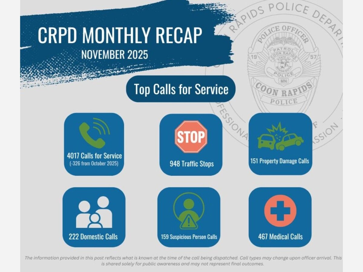 Coon Rapids, MN - The Coon Rapids Police Department has released its monthly recap for November 2025, offering residents a detailed overview of public safety activity and the range of service calls handled by officers throughout the city.