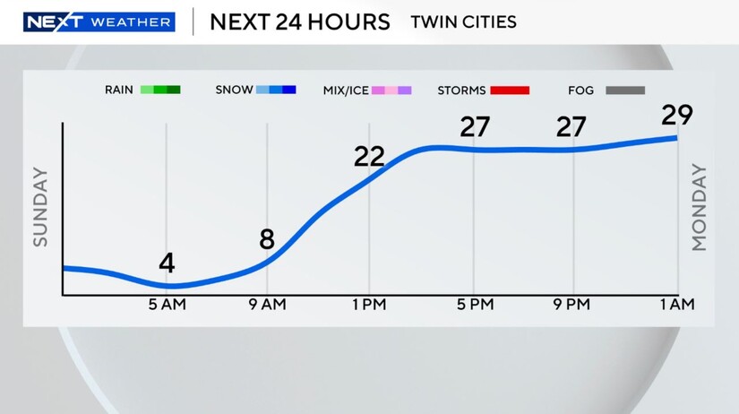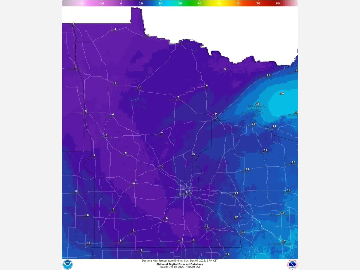 Daytime highs Sunday are expected to recover modestly, reaching the upper teens to near 20 degrees in the Twin Cities, with colder readings lingering in the north.