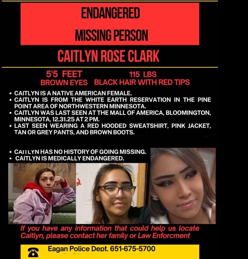 BLOOMINGTON, Minn. — Authorities and family members are urgently seeking the public’s help to locate Caitlyn Rose Clark, a 24 year old Native American woman who has been missing since New Year’s Eve and is considered medically endangered.