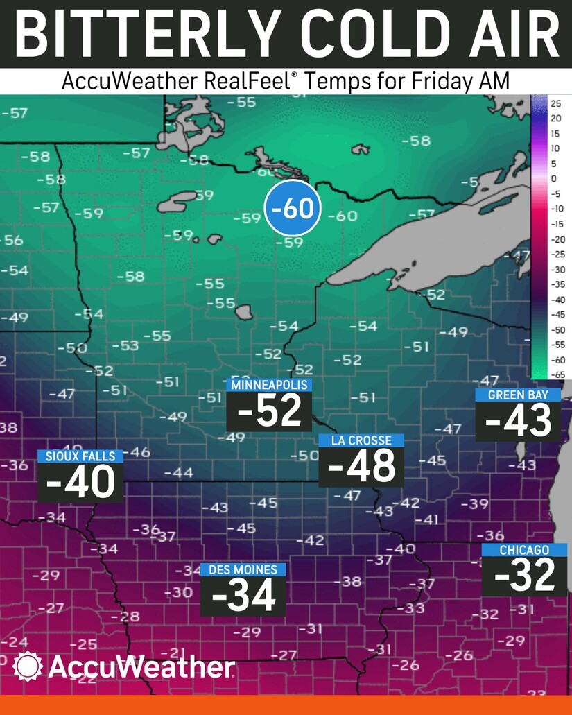 Wind compounded the danger. Persistent northwest gusts combined with the subzero air to produce wind chills as low as 63 below zero, including readings reported near Grand Marais along the North Shore. Across much of the state, “feels like” temperatures have consistently ranged between 40 and 55 below zero, levels at which frostbite can occur rapidly.