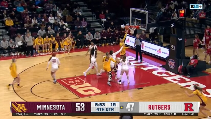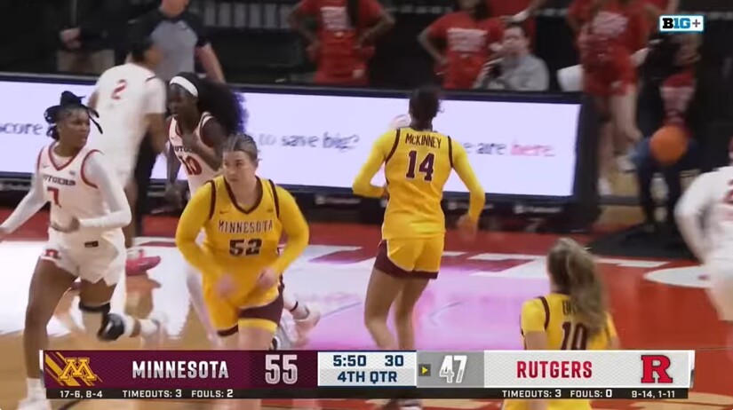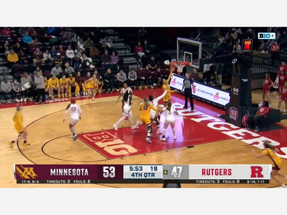 Minnesota erased the deficit and, after Rutgers briefly tied the game at 33–33, Braun ignited an extended run that shifted momentum. The Gophers outscored Rutgers 23–12 in the third quarter, shooting efficiently, attacking the rim, and earning frequent trips to the free throw line. By the end of the period, Minnesota held a 45–37 lead, supported by five fast break points and sustained pressure on both ends.