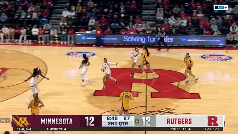 The opening quarter unfolded evenly. Rutgers built a brief 12–7 advantage before Minnesota closed on a 5–0 run, capped by a Hart basket in the final minute to tie the game at 12. The Gophers relied on perimeter shooting early, with two three pointers accounting for half of their first quarter output.