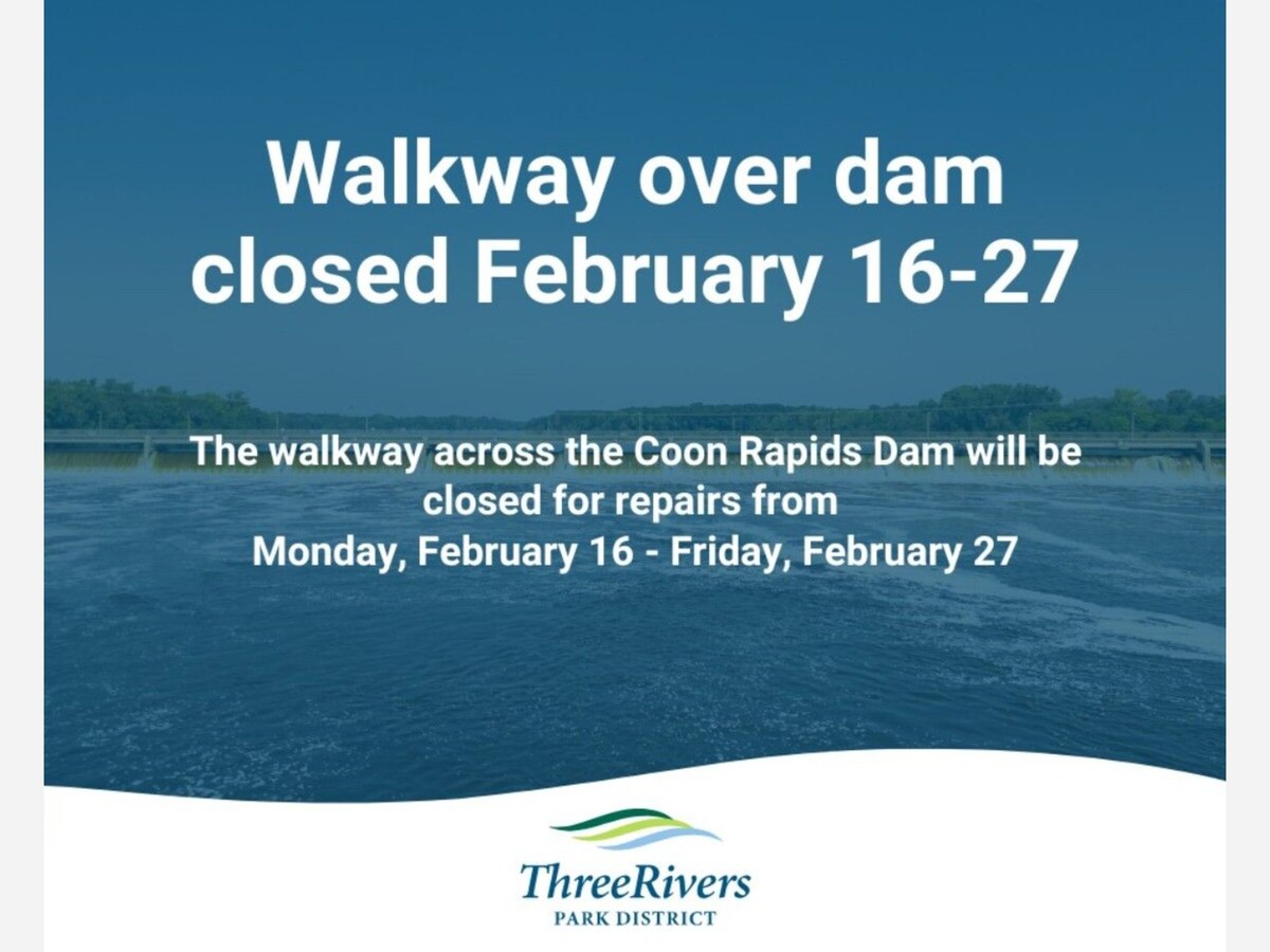 The 12-foot-wide walkway spanning the Coon Rapids Dam will close for scheduled repairs from Monday, February 16, through Friday, February 27, 2026, according to Three Rivers Park District and Anoka County Parks.