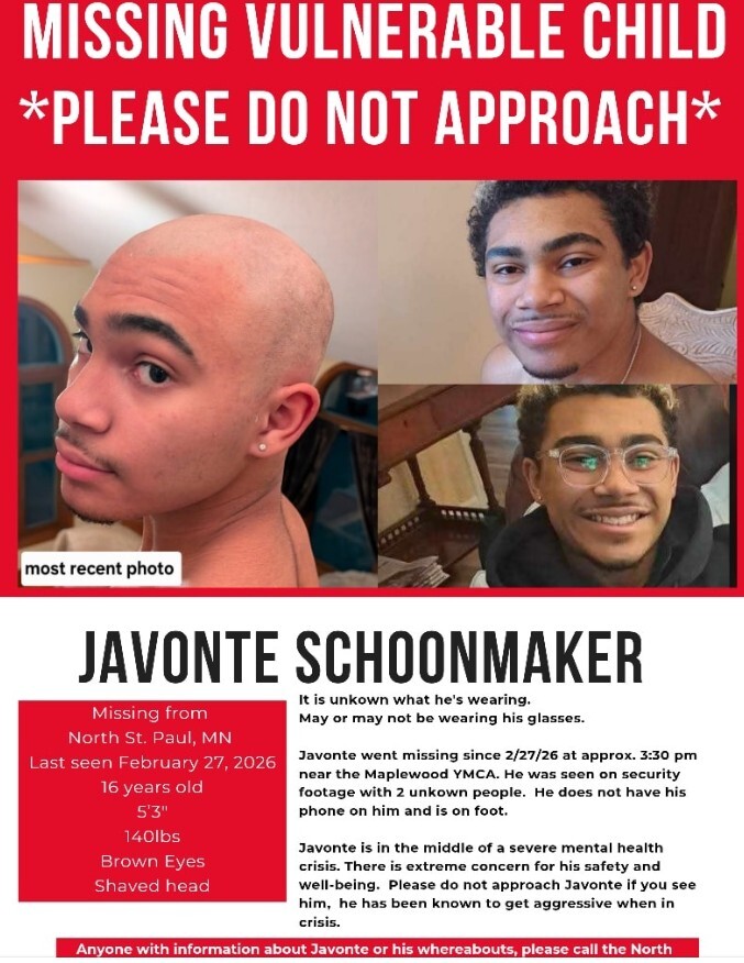 NORTH ST. PAUL, Minnesota (March 3, 2026) — On a late winter afternoon, as light waned over quiet residential streets and snow-dusted lawns, 16-year-old Javonte Schoonmaker stepped onto his skateboard and into the uncertainty that has now gripped his family, friends and an entire community.