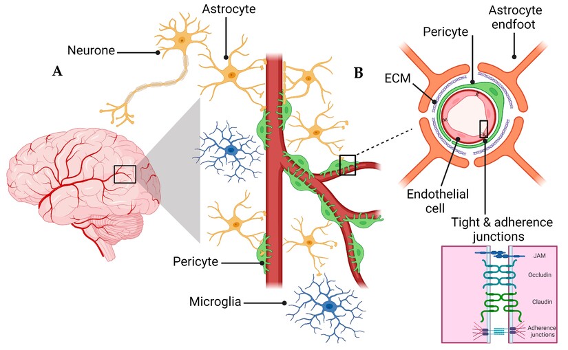The blood brain barrier is not a wall. It is a living boundary formed by specialized endothelial cells lining the brain’s blood vessels, reinforced by tightly sealed junctions and supported by surrounding cells including pericytes and astrocytes. This barrier decides what enters the brain and what does not. Oxygen passes through. Glucose passes through. Certain carefully controlled nutrients and signaling molecules pass through. Many pathogens, toxins, and drugs do not.