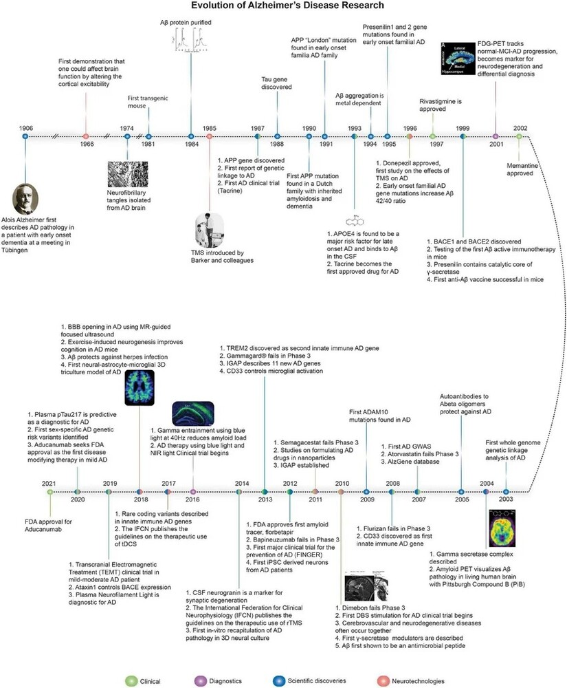 The timeline is not a victory march. It is a record of how difficult it is to treat a disease that is not one disease but a convergence of processes tied to aging.