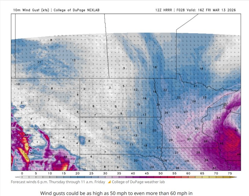 Wind gusts could reach 50 miles per hour across western Minnesota, with isolated gusts potentially exceeding 60 miles per hour overnight.