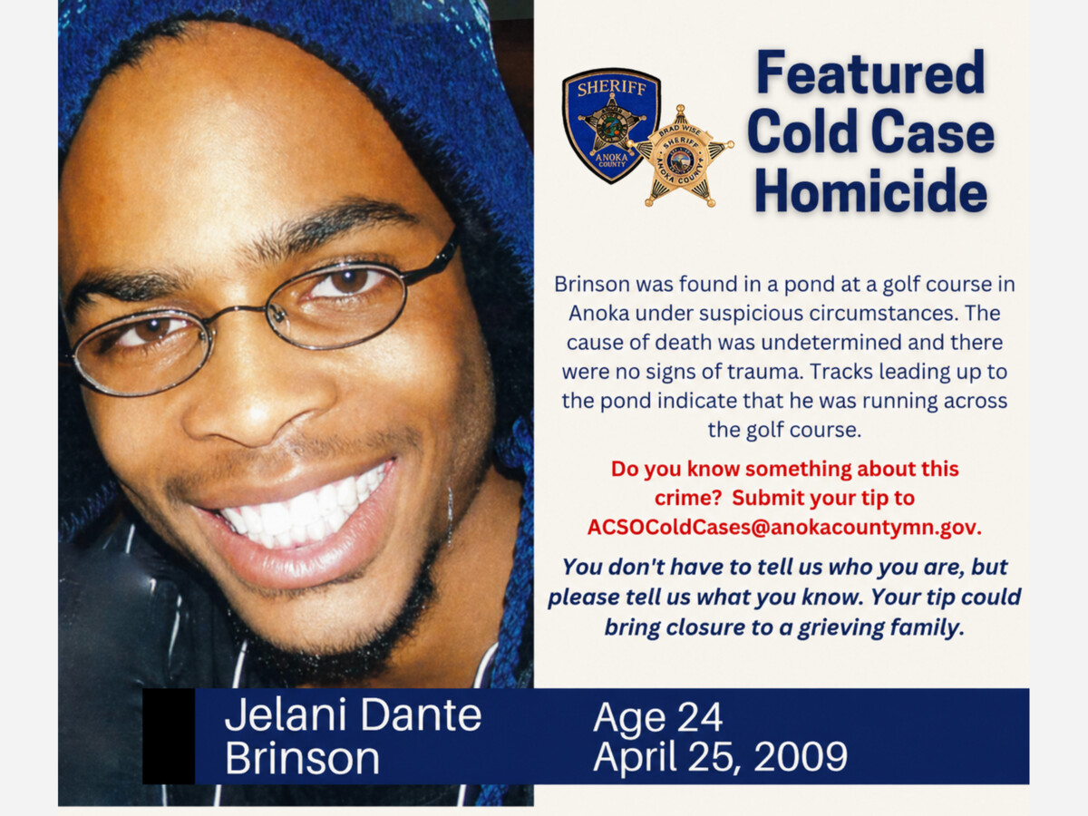 Brinson was found on April 25, 2009, approximately eight days after he was last seen on April 17 in the area of Kennedy Street behind the Anoka County Fairgrounds. Authorities have consistently described the circumstances surrounding his death as suspicious, and the case remains under review by the county’s Cold Case Homicide Unit.